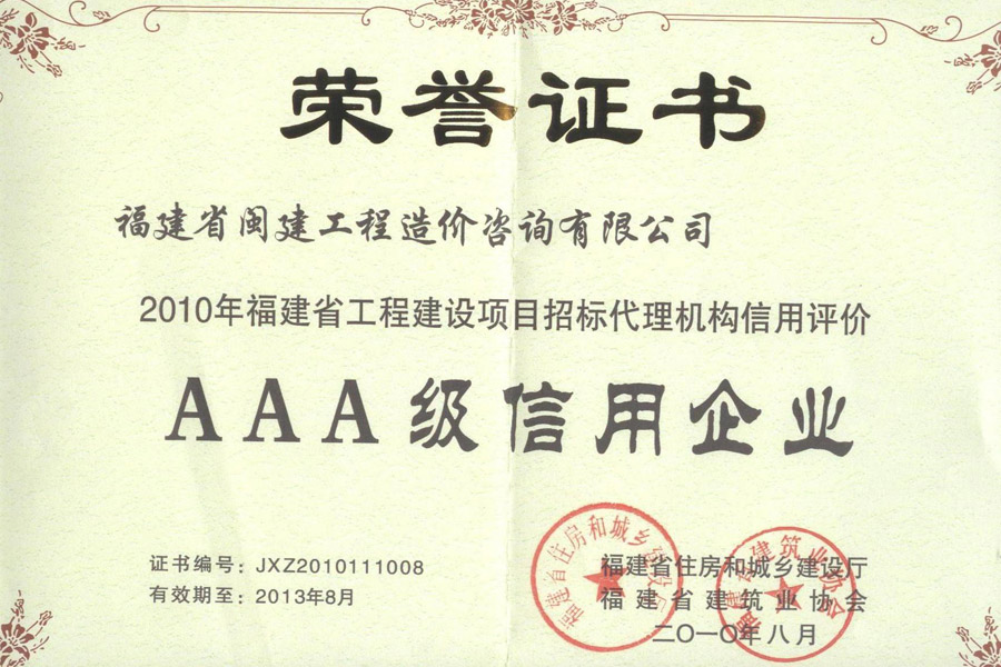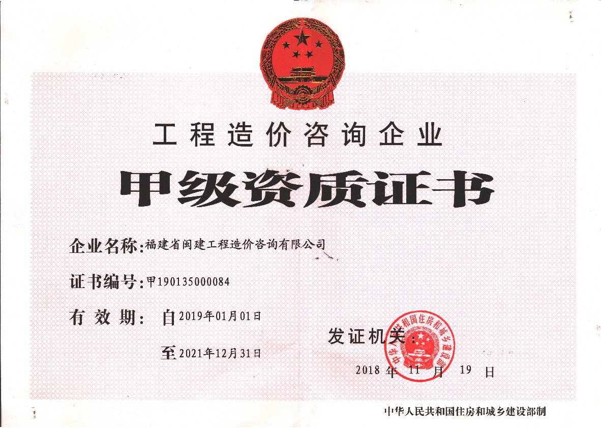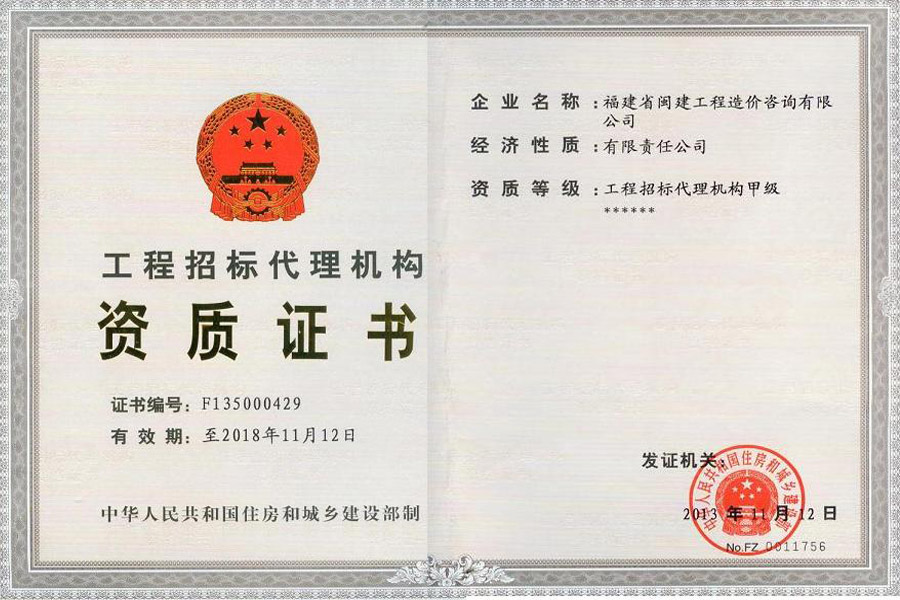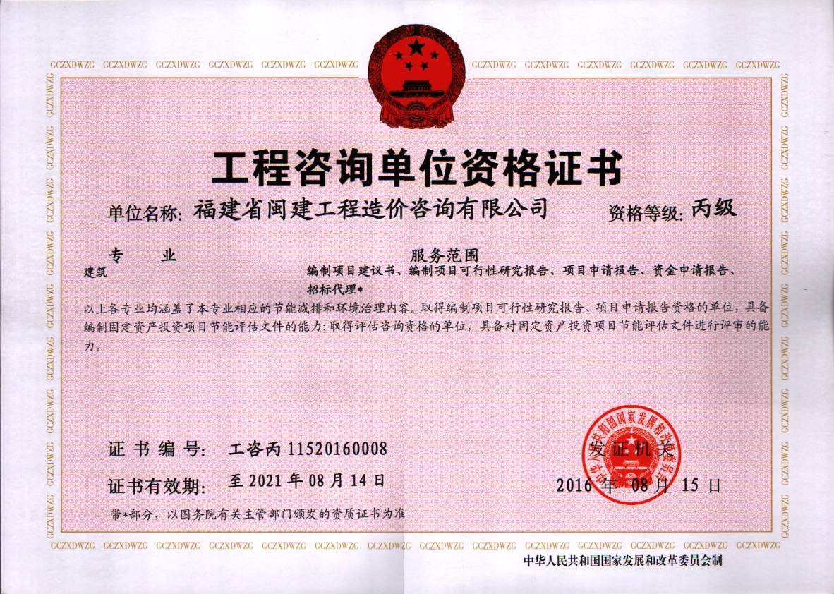 福建省閩建工程造價咨詢有限公司成立于1993年,原隸屬福建省建設(shè)委員會,2001年脫鉤改制為有限責(zé)任公司,公司注冊資本1200萬元,是一家具有甲級工程招標(biāo)代理資質(zhì)(證書編號:F135000429)、甲級工程造價咨詢資質(zhì)(證書編號:甲150135000084)、政府采購代理資質(zhì)、預(yù)備級中央投資項目招標(biāo)代理機(jī)構(gòu)資質(zhì)(證書編號:ZYTZ-C2013239)、丙級工程資質(zhì)(證書編號:工咨丙11520160008)的綜合性工程咨詢服務(wù)單位。能承擔(dān)各類建設(shè)項目的工程招標(biāo)代理、工程造價咨詢...